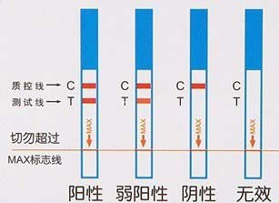 阳性(怀孕):二条红色反应线,检测区(T)及对照区(C)各出现一条红色反应线;检测区(T)颜色浅于对照区(C)颜色时(一深一浅),表示可能刚怀孕,请隔天用晨尿重测确认。